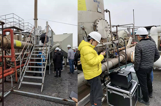 各廠家抵達工況現(xiàn)場,下午13點開始架設(shè)設(shè)備、預(yù)熱儀器,由于天氣潮濕原因SE3800開始時點火困難,經(jīng)過一段時間的預(yù)熱,儀器FID成功點火,15分鐘后FID基線平穩(wěn),儀器狀態(tài)良好,可以實施監(jiān)測工作。13點40分,所有廠家儀器準備就緒,同一時刻開始進行監(jiān)測工作。樂氏科技與嶗應(yīng)將儀器采樣探針插入工藝入口,開始采集樣品收集數(shù)據(jù)。